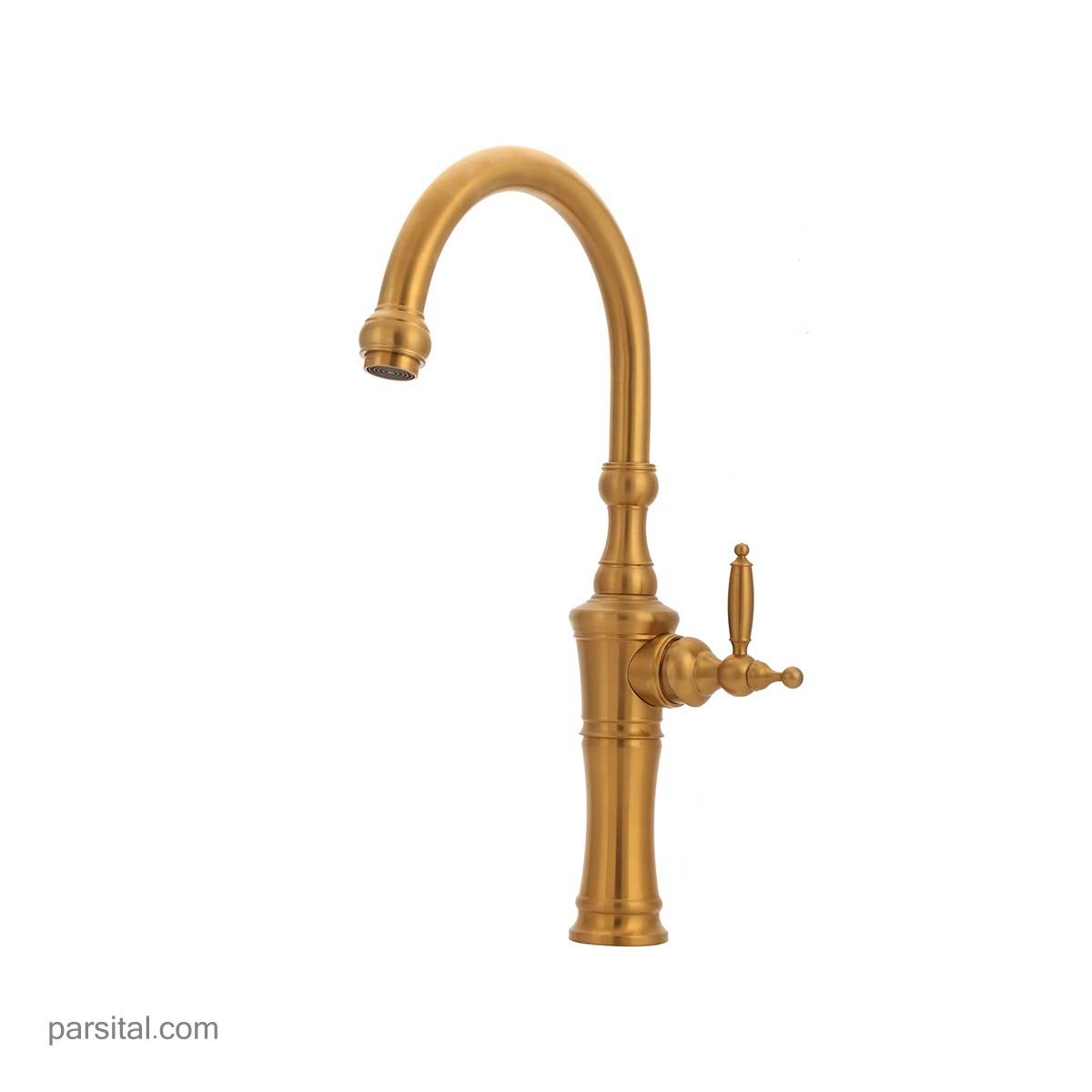 شیر ظرفشویی علم عصایی آتریسا مدل زیگموند با طراحی زیبا و خاص بصورت اهرمی و روکار روی سینک نصب می شود. در طراحی این شیر از آبکاری و پوشش طلا مات استفاده شده است.